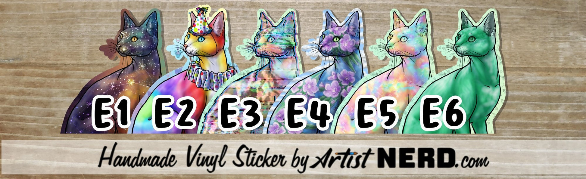 E1: Starry Constellation (Art Updated!), E2: Birthday Rainbow, E3: Glitch Cat, E4: Oleander, E5: Opal, E6: Jade