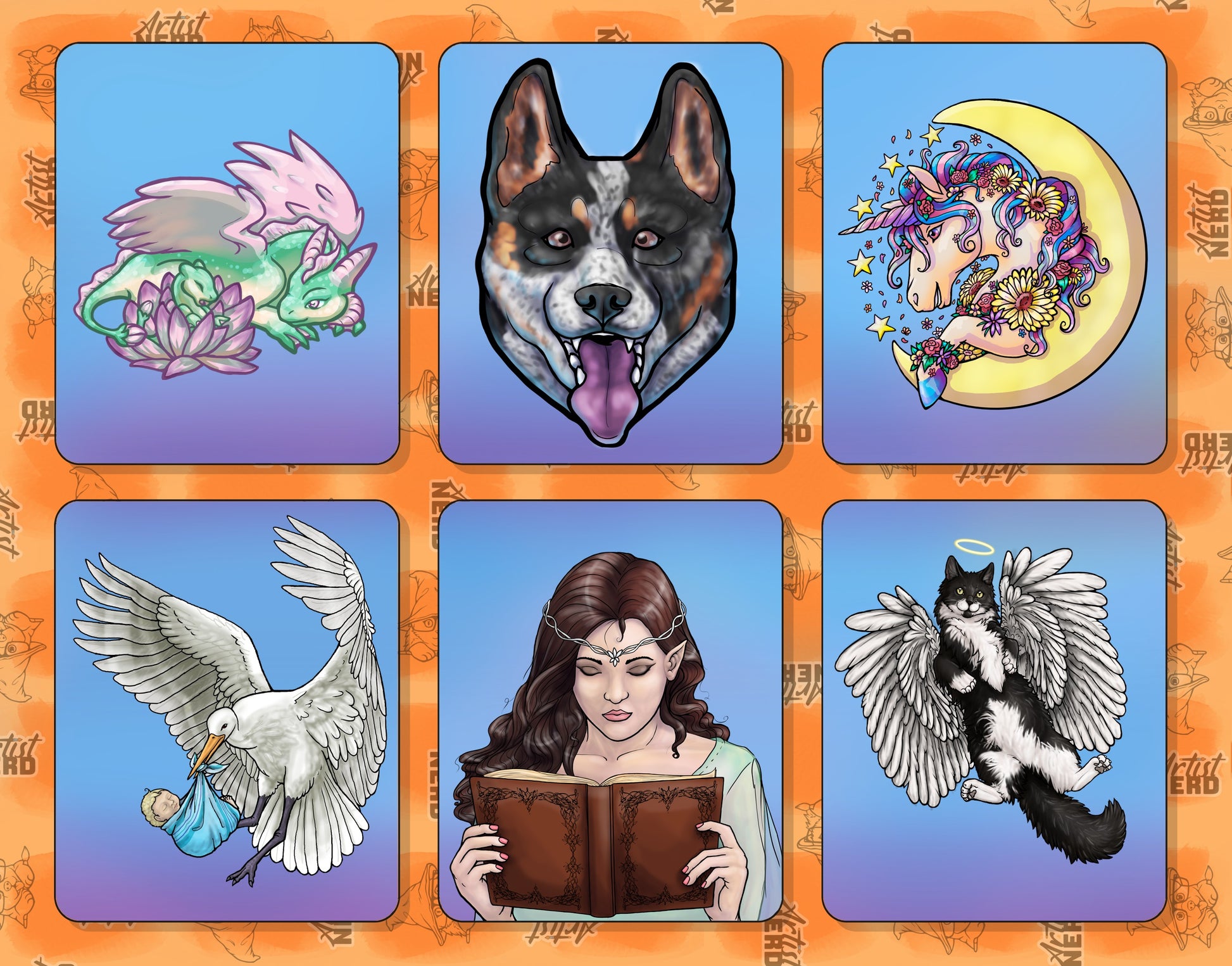 Colors picked from image supplied. Final product coloration may very slightly from actual pet/character due to shading (and printing if applied to custom products). One character/pet per base order. SFW requests only. Sorry, no full nudity or pornographic art. May be ordered multiple times for singles of different characters or add "Add Character" to add additional character to single art. Extremely intensive or detailed images requiring over 6 hours of rending will incur additional charges. (This is uncommon.) Final image can be used to customize any product here at Artist Nerd. Due to the custom nature of this product please allow up to 2-6 weeks for completion of this custom product.