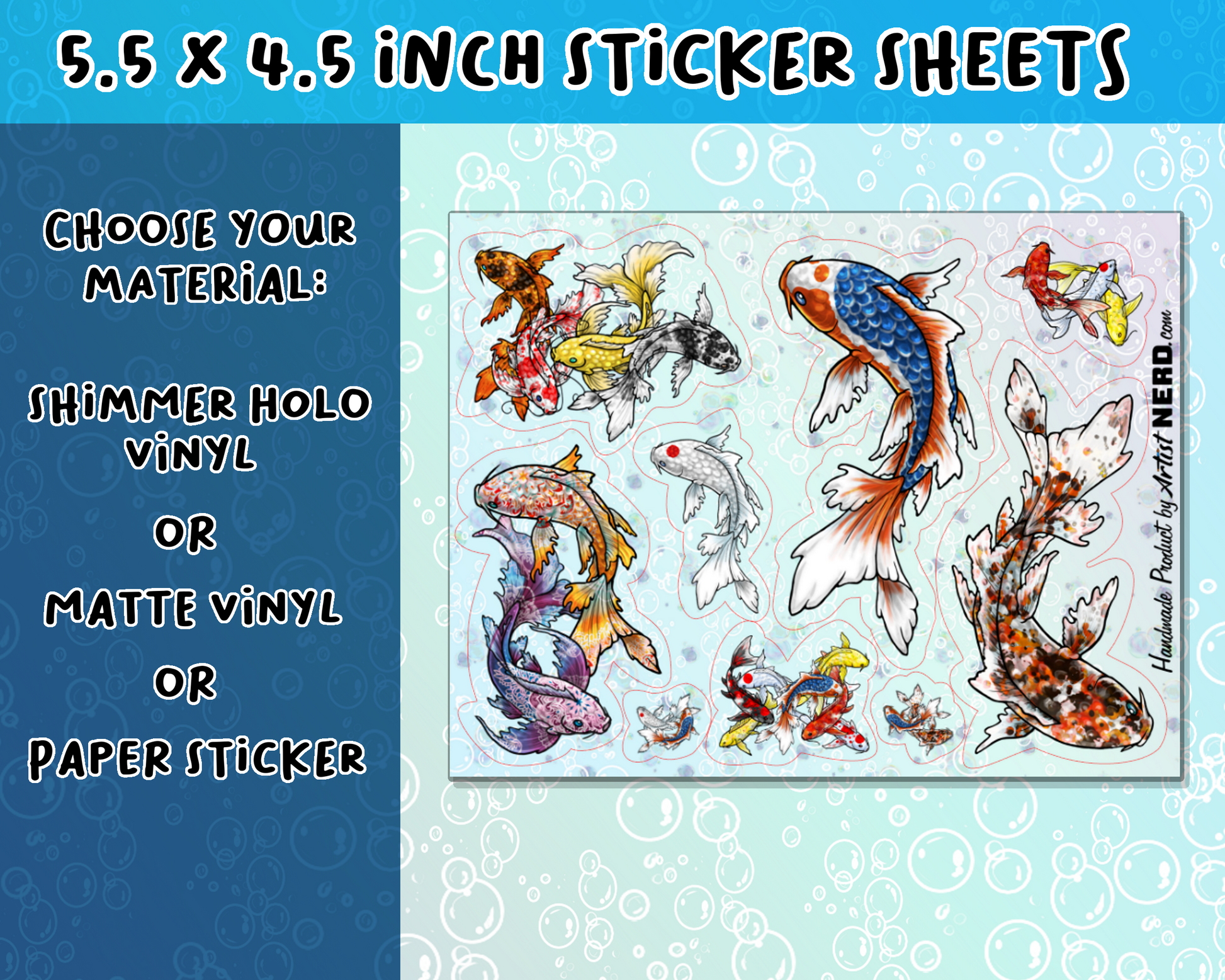 Fancy Koi Pond Laminated Vinyl Decal 5.5 inches Sticker Sheet - Matte Vinyl | Holographic Shimmer Foil Vinyl | Paper