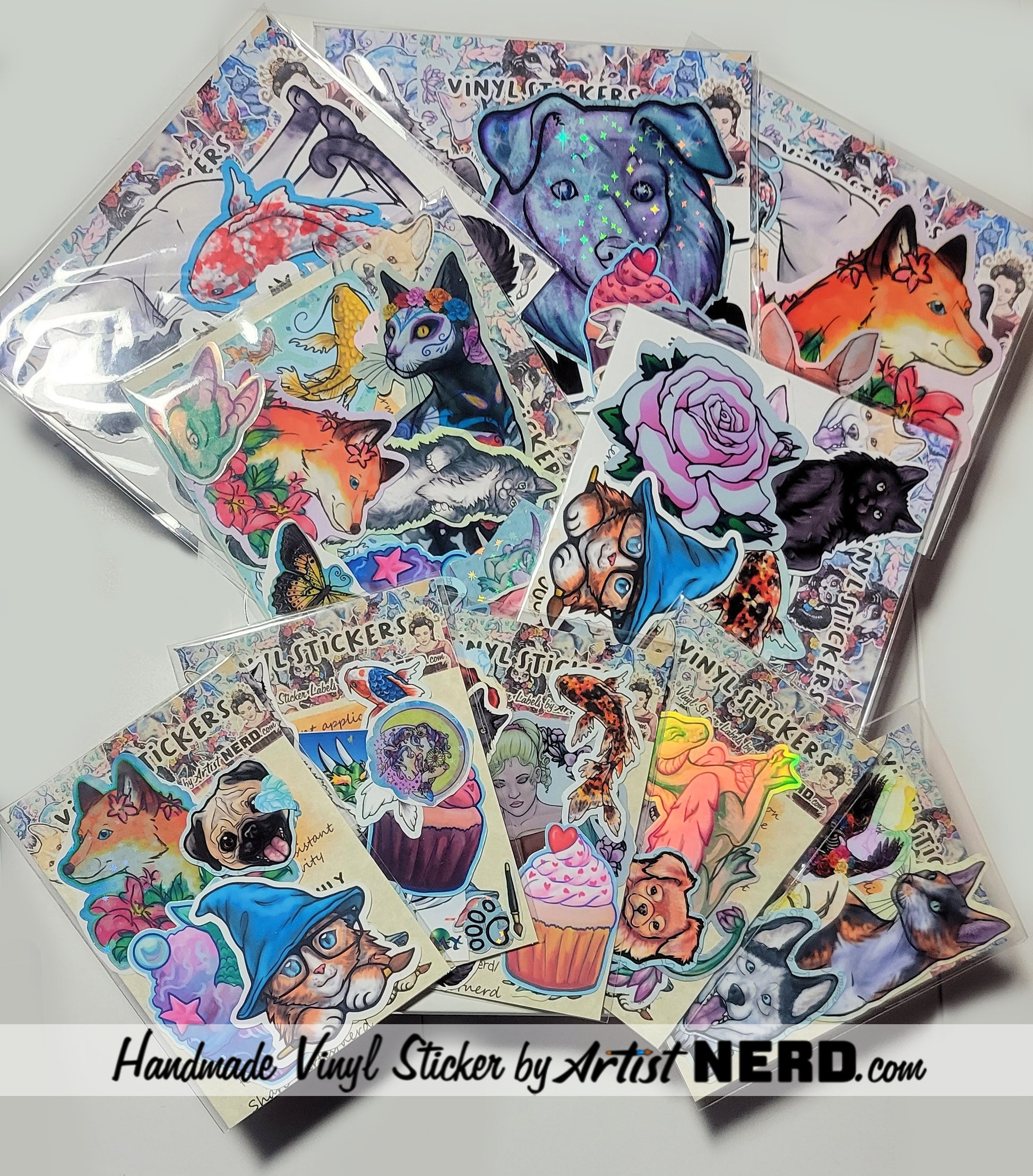 Sadly mistakes happen and while these stickers have their own charm they have not lived up to our quality control for one reason or another. While some may have been printed in the wrong size or a discontinued design, others may have some marred printing, lamination or cutting issues. Each of these stickers are unique in their failures but are charming in their own way. These stickers are great for calendars, scrapbooks, journals and other areas that don't require waterproofing as they may include marred laminate. Each pack contains a random assortment of Artist Nerd's vinyl sticker collection printed on white, clear, frosted, shimmer or starry glitter vinyl.